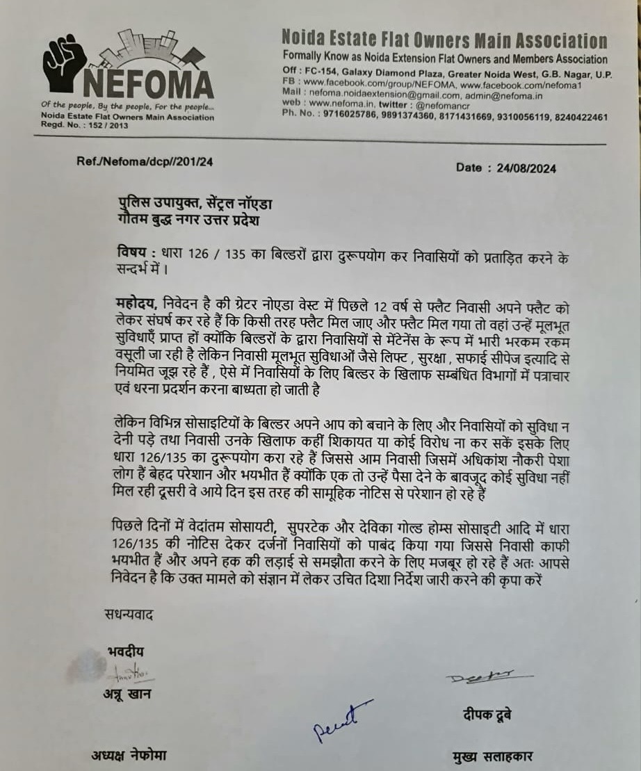 नेफोमा ने कहा कि विभिन्न सोसाइटियों के बिल्डर अपने आप को बचाने के लिए और निवासियों को सुविधा न देनी पड़े तथा निवासी उनके खिलाफ कहीं शिकायत या कोई विरोध ना कर सकें, इसके लिए धारा 126/135 का दुरूपयोग करा रहे हैं, जिससे आम आम निवासी जिसमें अधिकांश नौकरी पेशा लोग हैं, बेहद परेशान और भयभीत हैं क्योंकि एक तो उन्हें पैसा देने के बावजूद कोई सुविधा नहीं मिल रही, दूसरी वे आए दिन इस तरह की सामूहिक नोटिस से परेशान हो रहे हैं.