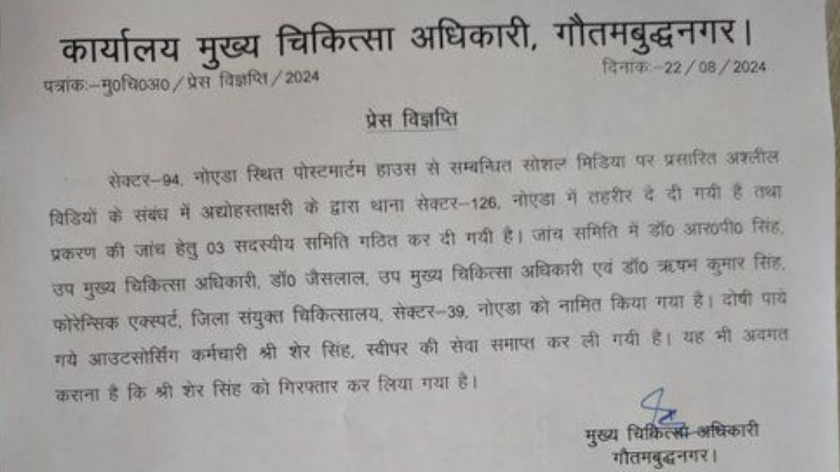आलोचना होने के बाद स्वास्थ्य विभाग ने सफाईकर्मी को नौकरी से निकालने के साथ ही आरोपियों के खिलाफ एफआईआर दर्ज कराई. पुलिस ने तीनों आरोपियों को गिरफ्तार कर लिया है. इसके साथ ही गौतमबुद्ध नगर के मुख्य चिकित्सा अधिकारी से भी जवाब मांगा गया है. साथ ही जिलाधिकारी ने भी संज्ञान लेकर सख्त कार्रवाई के आदेश दिए हैं. गिरफ्तार किए गए आरोपियों के नाम भानु प्रताप, शेर सिंह और परवेन्द्र हैं. भानु प्रताप की उम्र 29 साल है और वह मूल रूप से एटा का रहने वाला है. वह नोएडा के सेक्टर-94 में पोस्टमार्टम हाउस के पास रहता है. शेर सिंह की उम्र 39 साल है. वह भी पोस्टमार्टम हाउस के पास रहता है और मूल रूप से जिला अमरोहा का रहने वाला है. तीसरे आरोपी की उम्र 30 साल है. वह जेवर का रहने वाला है, लेकिन फिलहाल सेक्टर-126 रायपुर में रहता है. तीनों आरोपियों के खिलाफ धारा-296 बीएनएस, 67 और 67A IT ACT के तहत मुकदमा दर्ज हुआ है.